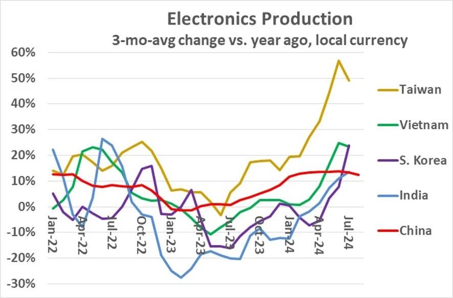 中國(guó)大陸仍然是亞洲最主要的電子產(chǎn)品制造商,但隨著企業(yè)將制造業(yè)務(wù)轉(zhuǎn)移到其他國(guó)家地區(qū),中國(guó)的增長(zhǎng)率有所放緩。疫情之后,中國(guó)的3/12增長(zhǎng)率變化在2023年4月由負(fù)轉(zhuǎn)正,并在2024年6月達(dá)到13.8%的峰值。然而,到2024年8月,這一增長(zhǎng)率降至12.3%,雖然是一個(gè)不錯(cuò)的成績(jī),但相對(duì)于亞洲其他國(guó)家地區(qū)的數(shù)據(jù)來說依然偏低。