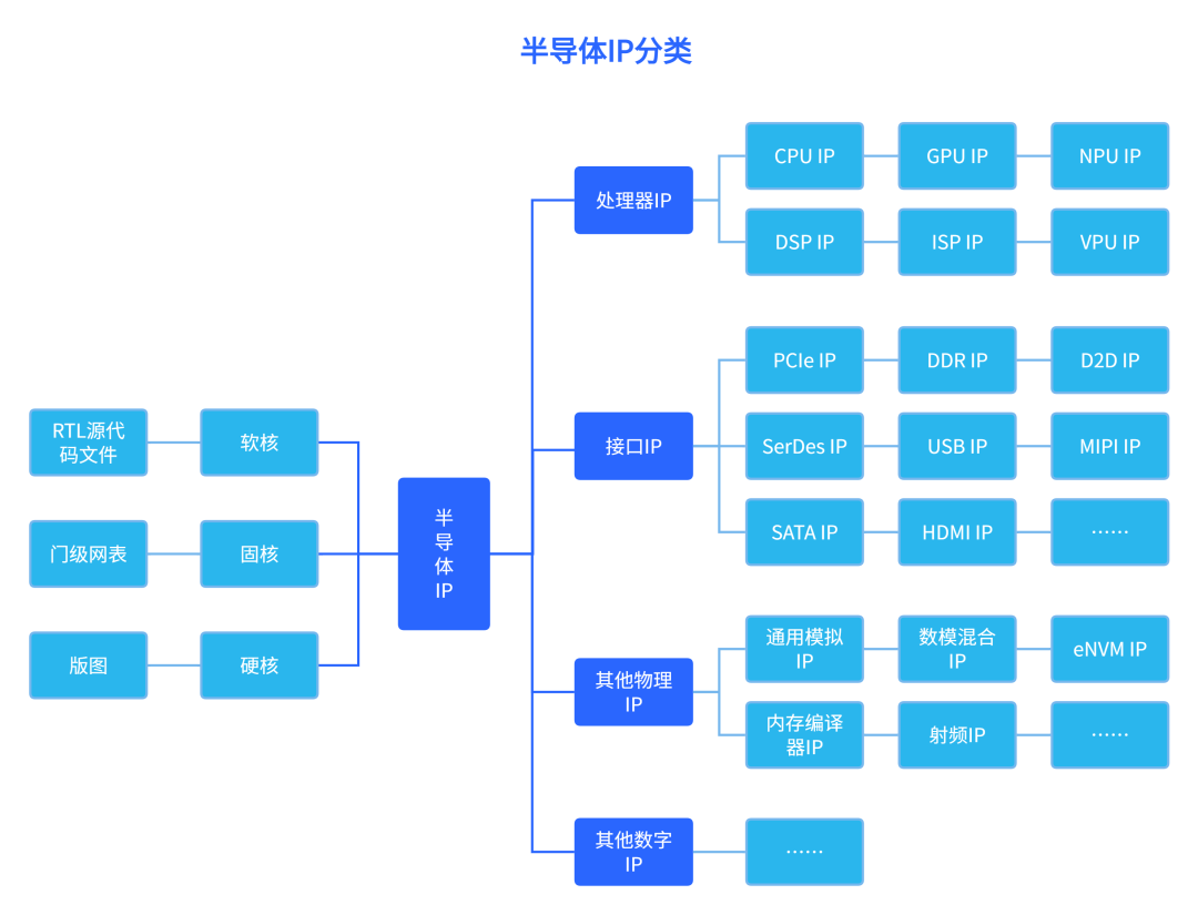 根據(jù)交付方式的不同,半導(dǎo)體IP可以分為軟核、固核和硬核。軟核主要以寄存器傳輸級(jí)(RTL)源代碼的形式交付;固核則以門級(jí)網(wǎng)表的形式提供;硬核則以版圖形式存在。